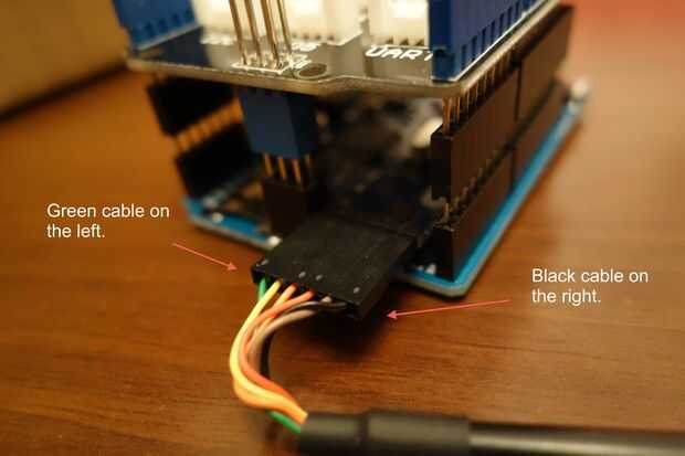 Comience conectando el extremo no-USB del cable FTDI a los seis pernos sobresale del lado de Arduino Ethernet. El cable FTDI tiene una variedad de arco iris de cables, y queremos que el cable negro que está a la derecha y el cable verde a la izquierda (con el escudo de arboleda orientado hacia arriba y el puerto ethernet Arduino Ethernet mirando hacia fuera). Si esto es confuso, solo revisa las fotos.