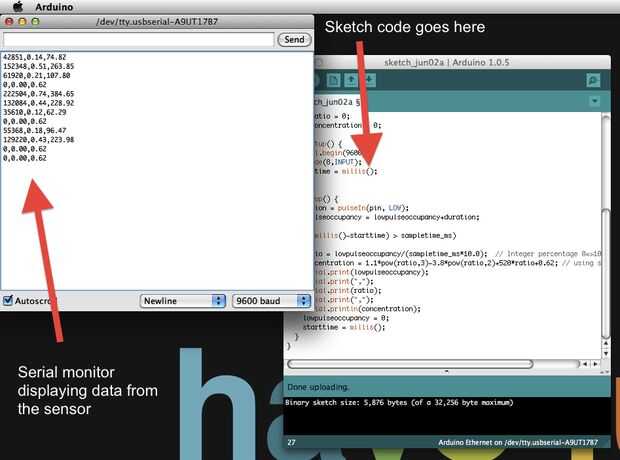Si Arduino Ethernet y el sensor de partículas están contabilizando valores cada treinta segundos estamos en buena forma. Puede ver valores de cero (0,0.00,0.62) de vez en cuando, pero no hay mucho que podemos hacer más allá de lo que hicimos con la hoja.