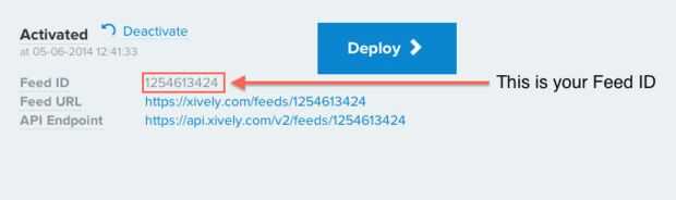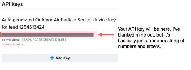 En la siguiente página (la página web del dispositivo, por así decirlo), a reunir dos piezas de información: una cadena aleatoria de letras y números el API keyy un número de diez dígitos el ID de la alimentación. Mira las fotos para ver donde en la página para encontrarlas. Copiar hacia abajo en un documento de texto y continuar al siguiente paso.