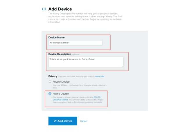 Escriba un nombre y una breve descripción de su dispositivo, ponerlo como "Público" (para que cualquiera pueda ver los datos que recolectamos) y haga clic en "Agregar dispositivo". El "dispositivo" estamos añadiendo es nuestro sensor Arduino Ethernet y el polvo.
