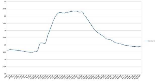 Ahora estará preparado para utilizar la temperatura de TSYS01 en su propio tablero del sensor. También es fácil de generar gráficos de temperatura de alta resolución utilizando el sensor. Por ejemplo la temperatura del aire de escape de mi cpu cooler antes, durante y después de una prueba de esfuerzo se muestra en la foto de arriba. El eje horisontal es segundos y el eje vertical es exhaus temperatura del aire en grados celsius. Tener un arduino conectado a la TSYS01 hace una bricolaje realmente precisa de la temperatura sonda para el uso con un ordenador cada vez que usted necesite! El gráfico en este instructable hicieron impresión CSV desde el Arduino al puerto serial y escribir los datos en serie en archivo con un script de Python. El código para hacer esto puede encontrarse desde: https://github.com/Apocalyt/spiTSYS01DataToCSV