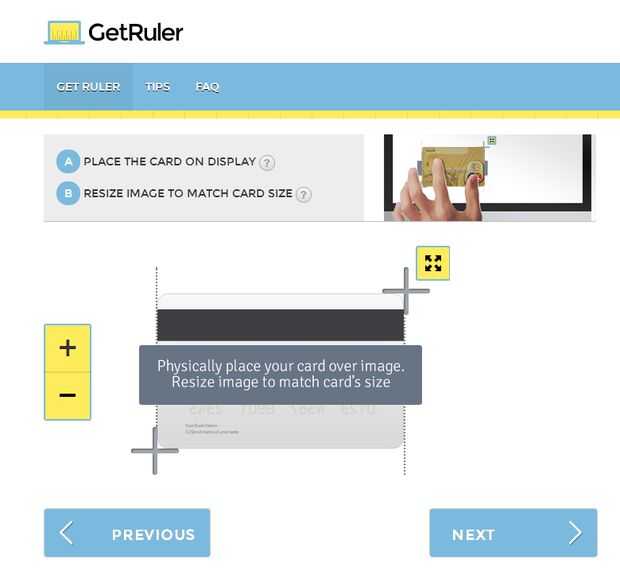 Si usas una tableta o teléfono móvil, no necesita calibrar la pantalla. Si utilizas un PC, se le pedirá poner tu tarjeta de crédito o tarjeta de presentación en la pantalla para que el gobernante Virtual le dará resultados precisos de lo que quiere medir. Ninguna información personal se recoge mientras se calibra.