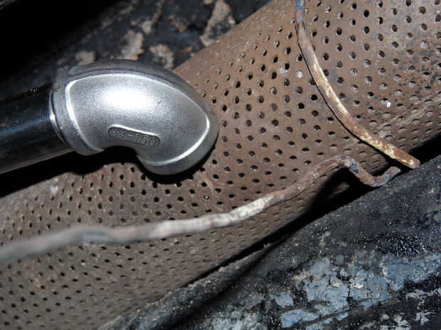 Primero un pequeño agujero piloto fue perforado a través desde el interior, teniendo cuidado de estar por encima de las rejillas delanteras, permitiendo suficiente espacio para acomodar una curva de acero inoxidable de 3/4" y tubo y suficiente espacio para extraer y sustituir las rejillas cuando se instala el tubo de alimentación de aire... Fig2