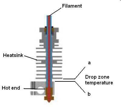 Asegurando un fuerte enfriamiento inmediatamente después de la zona de transición, se asegura que la temperatura aumenta, por ejemplo 200 ° C (b) 50 ° C (a) solamente 3 a 4 mm de largo. Este descenso rápido de temperatura evita el filamento (especialmente para el PLA que una fusión baja del punto) que en la zona de transición y bloquea la cabeza.