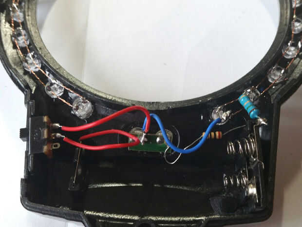 Finalmente conectar este circuito el swithch principal, los otros dos leds y soporte de la batería.