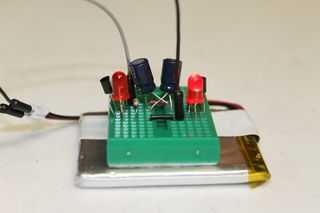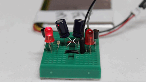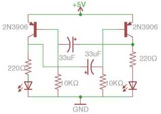 El circuito está formado por resistencias, condensadores y LEDs. Las resistencias de 10KΩ y los condensadores lo de mantener un ritmo constante, mientras que los transistores son responsables de encender el LED de encendido/apagado.