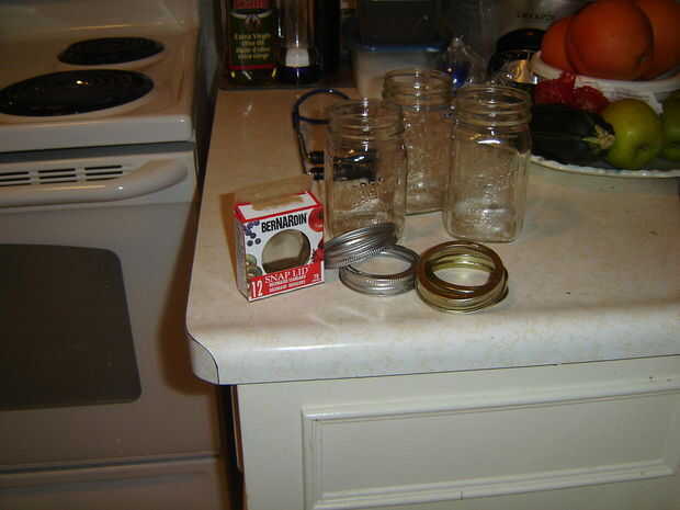Se necesitan 6-250 mL tarros con tapas de cierre y tornillo de bandas. Si usted está comprando frascos nuevos debe vienen con las tapas de presión y las bandas con rosca. Si están reutilizando tarros Asegúrese de comprar nuevas tapas de complemento como estos no deben ser reutilizados.