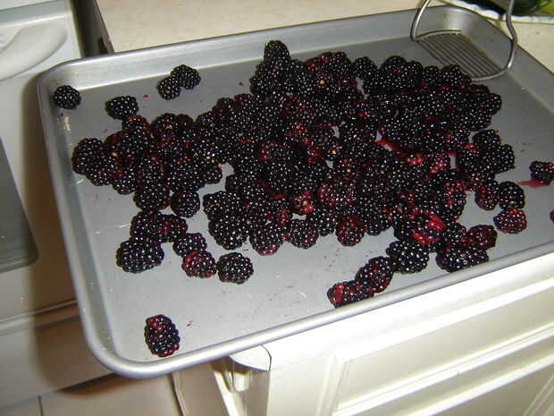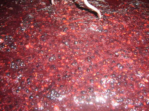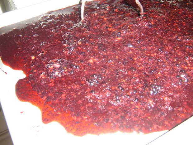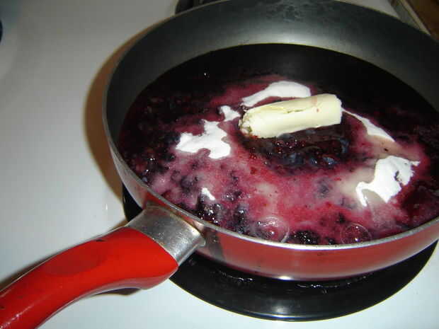 1. lavado * tus bayas. Coloque sus bayas en una bandeja para hornear y utilizar una trituradora de la patata para aplastarlos. Mida 4 tazas y coloque en una olla grande de la salsa.