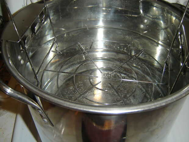 1. Coloque su estante de conserva en el fondo de la olla. Coloque sus tarros en la olla y la tapa con agua. Llevar a fuego lento (180 f / 82 C).