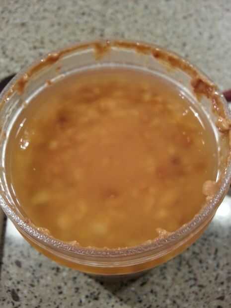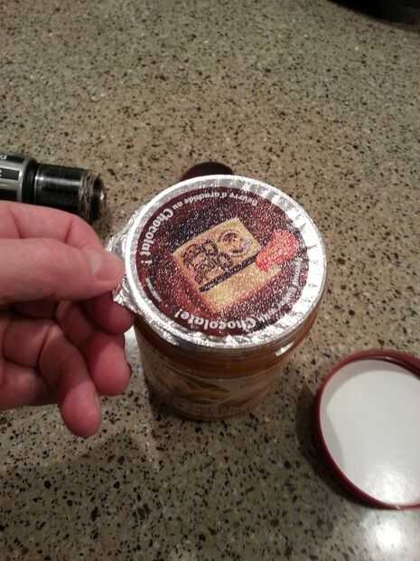 El primer paso es pelar apagado la lámina superior. Verás que el aceite está sentado en la parte superior. Sin aceite en la mantequilla de maní, el resto de la jarra es más difícil de remover. Línea de fondo; tienes que mezclar.