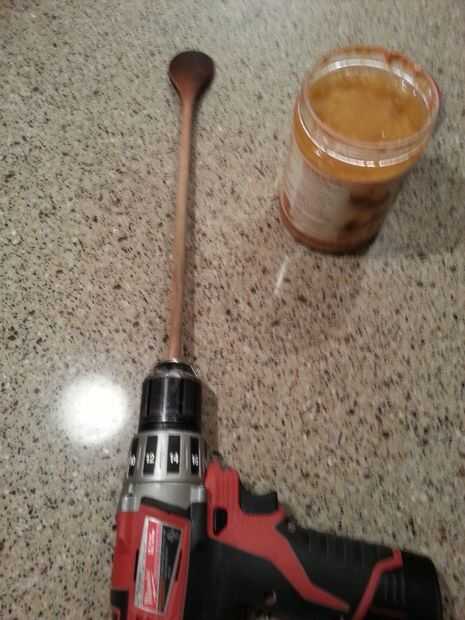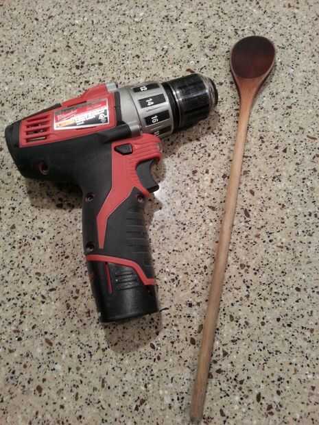 Para esta tarea, necesitamos poder de agitación grave. Utilizo un taladro de 12V para la tarea. El primer paso es encontrar una cuchara de madera. La cuchara en el taladro con seguro de balín lo mismo como si fuera una broca. Este ejercicio se puede establecer a baja velocidad o alta velocidad (2) (1). Póngalo en marcha baja.