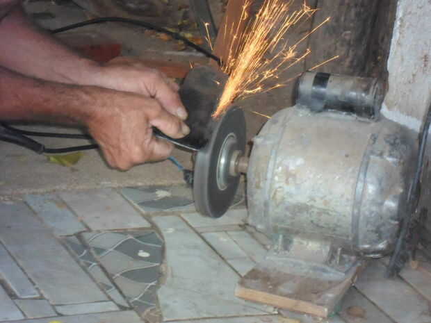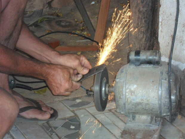 Bueno, si realmente quieres el hacha para ser funcional, debe afilar el filo, en mi caso he usado un molinillo eléctrico, debido a hechos evidentes. También es buena idea poner dos agujeros para predicar la hoja en el mango.