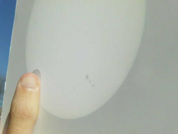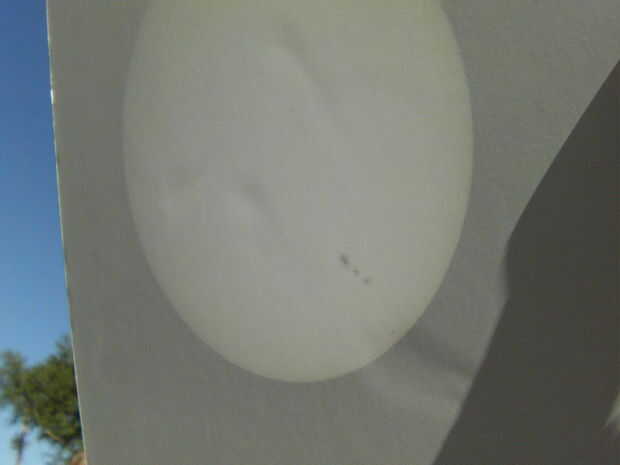 mantener la cartulina hasta el telescopio con la proyección del sol que brilla en él. Mueva la cartulina más lejos y más cerca del telescopio para hacer la imagen más grande y más pequeño. Nota: cuanto mayor sea la proyección el amortiguador al cuadro. ajustar el enfoque y ahí lo tienen! Aquí es también donde vienen las gafas de sol.