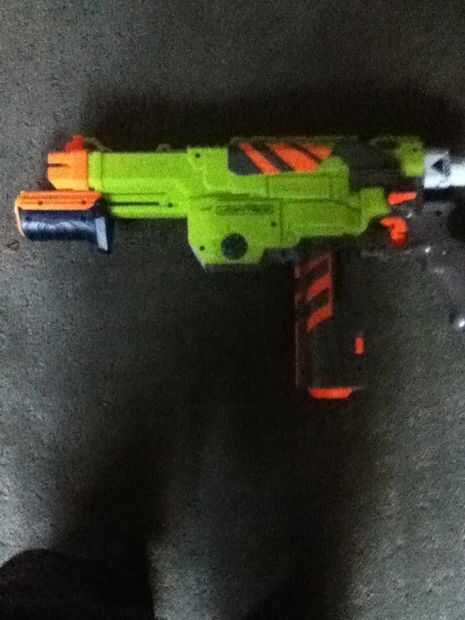 Este es mi primer Mod de Nerf.Añadí un viejo ámbito de pistola de airsoft y modificado para que quepa en el nerf, agarró dos revistas, asegúrelas con cinta para un dual mag y hasta ahora trabajan excelente, y he hecho un pequeño silenciador para las