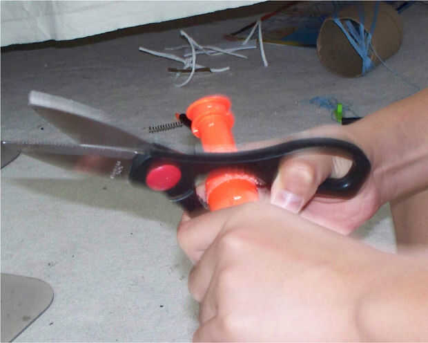 En primer lugar, usar algo con dientes de metal que pueden agarrar el barril como una galleta de la tuerca, o lo utiliza para crack langosta y conchas de cangrejo. Mi solución fue en la parte inferior de un par de tijeras de cocina. Tome la parte del cañón donde necesito abrir con las tijeras y use mi otra mano para girar el cañón en el lado más grande, no tubo de dart, creando un caos de pedacitos de plástico. Hice esto durante un buen rato, digamos 20 minutos. Luego, usando un cuchillo, cuña de un recorte de unos 2-3 mm de espesor, repitiendo un par de veces para hacer un surco circular todo. Lentamente, frustrante, pero sin duda, el cañón comienza a desarmarse. Suavemente mueva los dos bits de vez en cuando para comprobar.