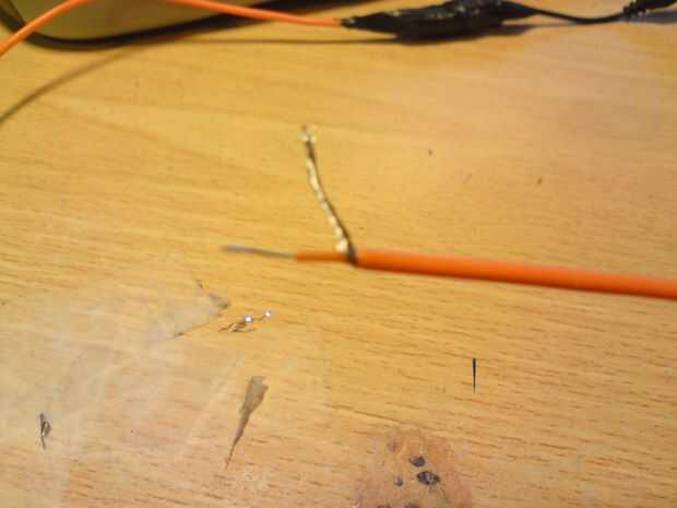 Ahora haz tus tijeras y y con cuidado el aislamiento desde el exterior de thecable hacia el altavoz, asegúrese de no cortar el cable, luego la parte interna del aislamiento y separar a los dos, ahora despojado, cables. (Nota: esto se puede hacer mucho mejor con unas tenazas o un cuchillo stanley.)