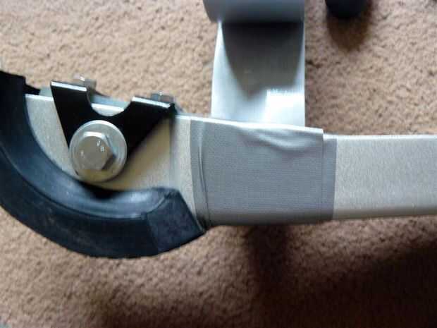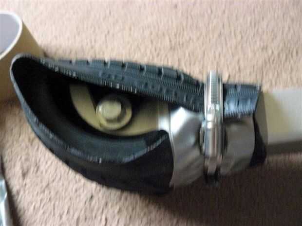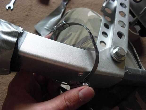 Ahora es el momento de poner las abrazaderas de manguera/Jubileo alrededor del brazo del enganche (foto 4). Tuve que poner dos para que encajen.