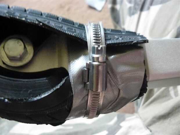 Ahora tire el resto del botín en la pezuña. Que sea tan estrecha como sea posible. Idealmente es un trabajo de dos hombres. Empezar a apretar los clips (Foto 5). Si utilizas dos, intente apretar ambos igualmente. Hacen algo apretado. No desea botín se deslice (foto 6). No apriete tanto que el marco comienza a doblar. eso sería realmente malo.