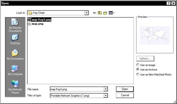 1. en el menú de la barra seleccione Archivo--> Importar. Aparece el cuadro de diálogo de importación. Seleccione la imagen del mapa a la importación y a la derecha selecciona "Usar como textura" luego seleccione Abrir (Figura 1-4).