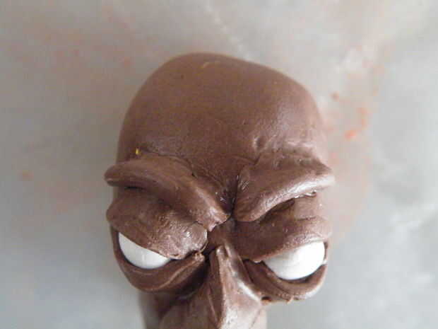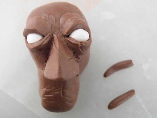 Hacer dos salchichas delgadas similares del material modelado y los ponen por encima de los ojos, en la costura donde suavizan en la tapa superior del ojo.
