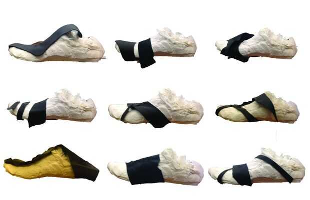 Tomar a algún retazo tiras y colocar sobre el calzado en diferentes orientaciones. La tela puede ser cualquier cosa, un rasgado para arriba camiseta, piel artificial, lo que tienes que poner sobre. Incluso puede ser tiras de papel de estaño o bolsa de plástico. Cuelgue los últimos y tomar una foto en el perfil. Repita con diferentes drapings un par de veces, 10 veces es suficiente, pero no tantos como quieras. No tienes que poner un montón de pensamiento en esto, esto es sólo una manera de ayudar a generar ideas de diseño.