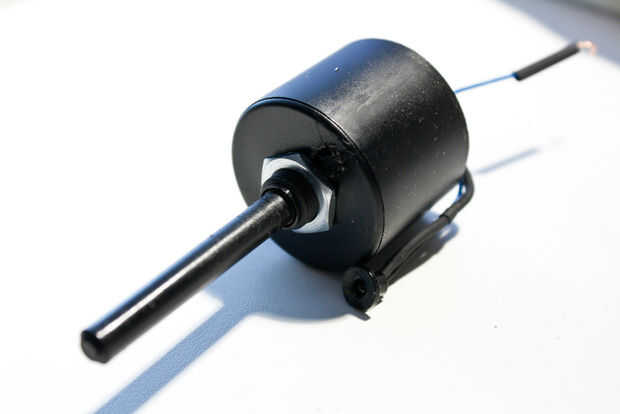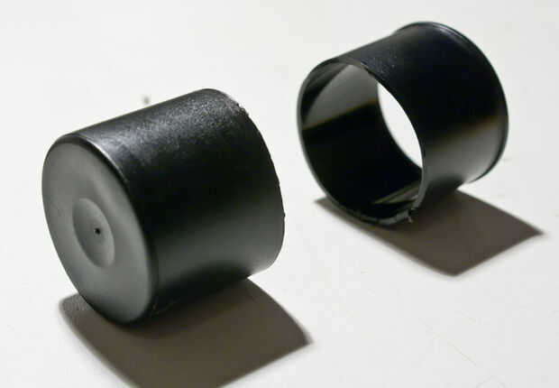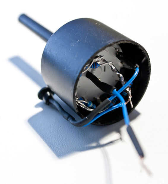 Para el cuerpo usé una lata de película negra. Me he cortado el cilindro a la medida luego perforar el agujero en la parte inferior de la perilla de funcionamiento. El módulo instalado en el cartucho muy bien. Ahora es un buen momento para cortar el poste operativo para tamaño y ajuste la perilla. He cortado una abertura en la tapa para el bombeo poco alrededor del agujero ex-foto-celular, luego pegué la tapa de la lata boca abajo el cuerpo flash por lo que podría más adelante sólo pop en el módulo.