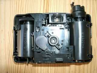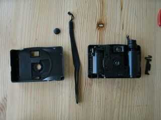 Ahora simplemente separe las mitades de la cámara. Dos cosas probablemente caerá hacia fuera. En primer lugar, el botón del obturador; recuperar y poner en una bandeja de las piezas. Segundo, el mecanismo de cierre de plástico; Saque así y poner en una bandeja.