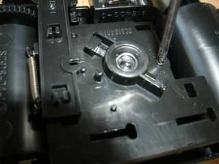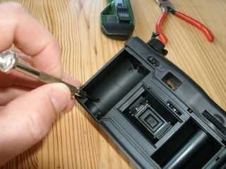 Abrir la espalda y mirar en la cámara de alimentación de la cámara. Hay dos tornillos adicionales en la oscuridad. Los saque y ponga en la bandeja de las piezas. Una nota sobre los tornillos: si les alinean, verá que la longitud no es estándar. Creo que esto es sólo variaciones en la fabricación y no debe de ensamblaje o montaje. Cualquier tornillo debería funcionar en cualquier agujero para que no te preocupes por los tornillos de etiquetado. No es importante en esta cámara.