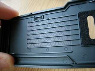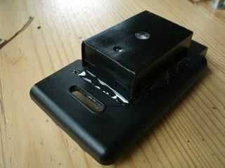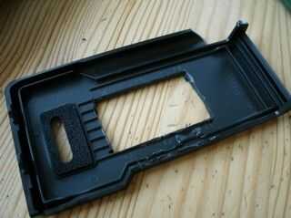 OK, apartar las entrañas de la cámara y se concentran en la parte posterior. La idea es cortar la parte trasera lo suficiente como para exponer la película, pero dejando suficiente para dirigir la película a través de la cámara. Por suerte, las marcas en la parte trasera pueden utilizarse como una guía.