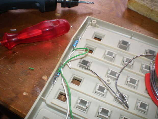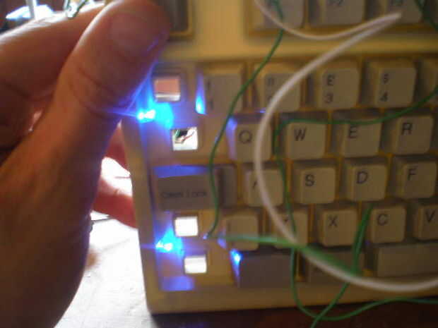 ¿Feliz? Posición de los LEDs de tal manera que brillan entre las filas de teclas. Haz medieval con la pistola de pegamento y fijar su posición.