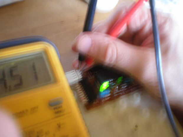 La soldadura de los cables de los LEDs (blanco = VCc, verde = tierra en las fotos)