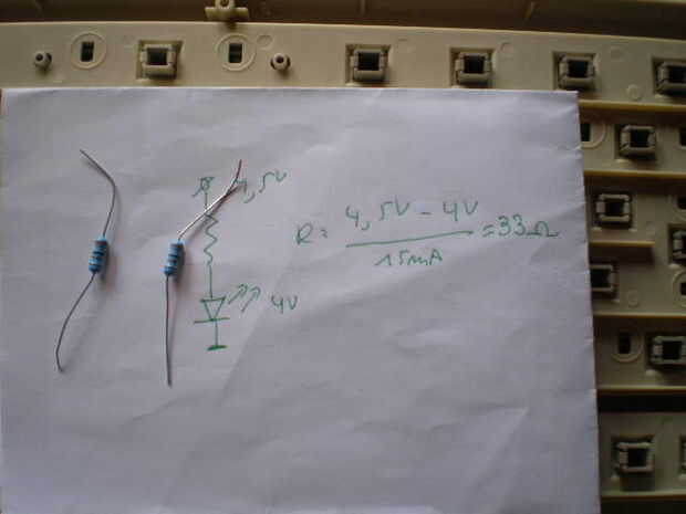 Luego calcular las resistencias limitadoras actuales que necesita, usando la ley de ohms. Elegir 15mA para lo LED actuales. Los LEDs azules de mi junkbox tenían una gota de 4V (debe ser muy chungo).
