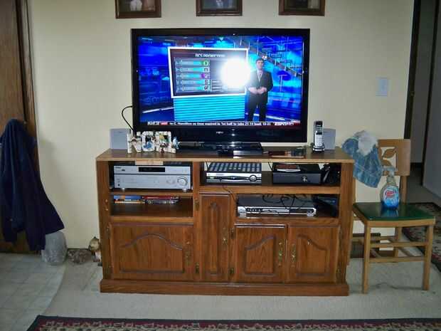 Pegamento y lugar manto, use el mazo otra vez si las clavijas encajan firmemente en los orificios que ha perforado. Añadir un peso pesado en la parte superior hasta que el pegamento se seque para asegurar una buena adherencia. Allí puede poner su tv, pesa un montón.