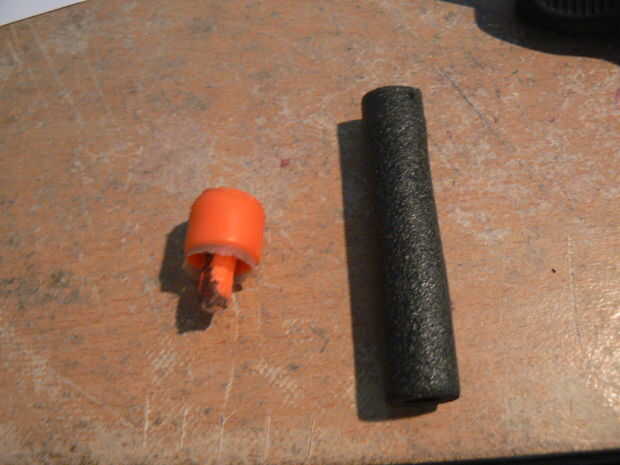 Paso 1: fuentes de NecesitaPistola Nerf--Unos 8 en de hilo-Tijeras-Tac pulgar (Similar a la de la foto)-Nerf bala (puedes usar los que pegan a plasticky cosas demasiado pero estoy usando el que está en la foto)Paso 2: Sacar la tapa de goma Cortar la