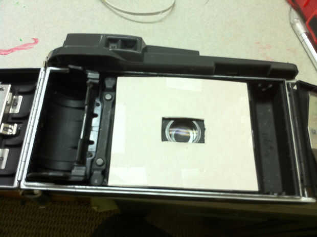 Mientras está secando, tomar 2 piezas de papel y cortar para caber en el agujero hasta el borde. Luego corte un pequeño pedazo de papel que 7/8" de alto por 1 5/16" de ancho. En la primera hoja trace una línea estrecha diagonalmente a través del papel de esquina a esquina haciendo una x. Haga lo mismo en el pequeño pedazo. después de tener ambos x meter una derecha del agujero donde las dos líneas cruzan (el centro) en ambas hojas. Poner encima de la otra y ahí lo tienen!. Trace una línea alrededor del exterior del rectángulo pequeño tan su en un pedazo de papel. Ahora tiene el tamaño estándar negativo y se centrarán detrás de la lente.