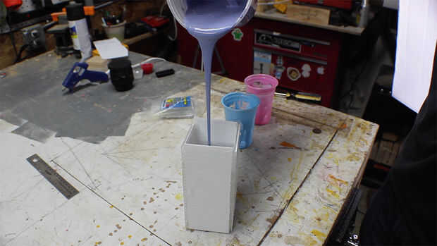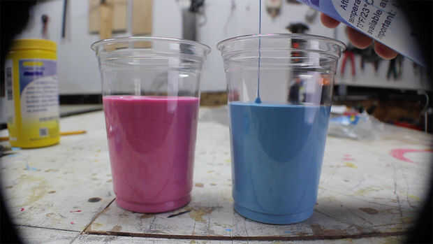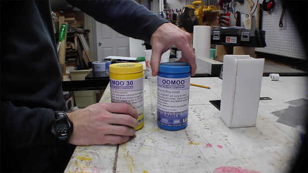 Usé el Oomoo 30 para el molde, porque es asequible y fácil de mezclar. Es una relación 1 a 1, tan sólo vierta partes iguales de dos tazas, luego vierten juntos en un recipiente lo suficientemente grande. Mezcla muy bien, asegurándose de raspar los lados y fondo del recipiente. Asegúrese de que tiene un color consistente, con ningún remolino.