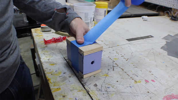 Envuelva el molde con cinta azul, para cerrarla. Utilice un trozo de madera a cada lado para distribuir la presión de la cinta, que debe ser mínimo. No apriete el molde o deformará... simplemente mantenerla juntos.