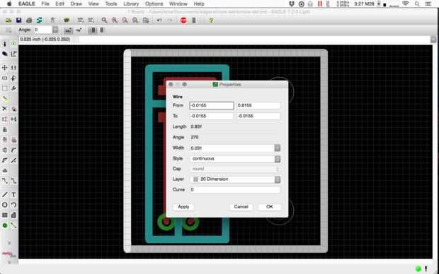 La capa de la dimensión es el siguiente. Esta es la capa que define el contorno de la Junta. La capa de dimensión es capa 20, y el contorno es por defecto un cable con un ancho de 0. Se generará una trayectoria de herramienta no importa lo que el ancho de una fresa de 0.031. Estas trayectorias definen la trayectoria del centro de la herramienta, que significa con un diámetro de herramienta de 0.031, la Junta será subdimensionada de 0.031. Si usted no necesita un pcb precisamente de tamaño, no te preocupes acerca de él. Si lo hace, debe compensar el esquema dimensión ser 0,0155 pulgadas desde el centro del tablero. También quiere cambiar el ancho del cable para reflejar el diámetro de la herramienta.