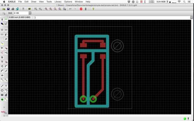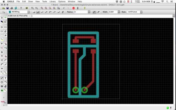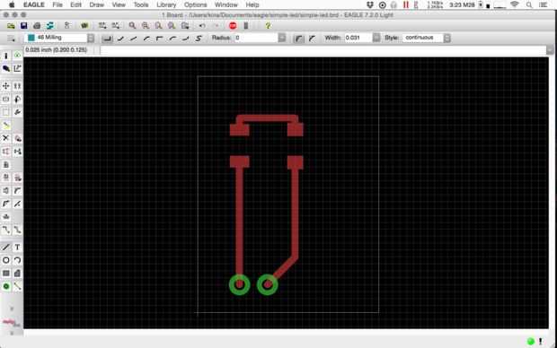 Estamos empezando con un simple archivo de Eagle. Es una resistencia, un LED y un encabezado de dos pines para alimentación. Los archivos terminados se unen a esta página. En este punto ya he presentado a la Junta. Yo estoy mostrando capas 1-20, 45 y 46. Creo que es más fácil de dibujar trayectorias de herramienta de esta manera, sin cualquier información superflua.