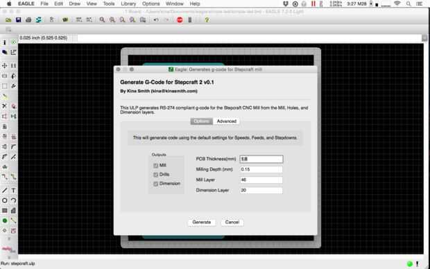 En la línea de comandos, escriba: "run stepcraft.ulp" y usted debería ver un cuadro de diálogo pop-up. Usted tendrá que medir el grosor de tu PCB con cuidado y entrada en el cuadro de diálogo (en mm). También puede cambiar las capas de destino para las trayectorias de herramienta de fresado y la dimensión y la profundidad de fresado. Yo uso 1,6 mm de espesor PWB FR-2 con revestimiento de cobre 1oz y estos trabajos de ajuste bien para mí. Puede también seleccionar (o deseleccionar) cualquiera de las tres salidas si no desea generar un archivo de molino, taladro o dimensión.