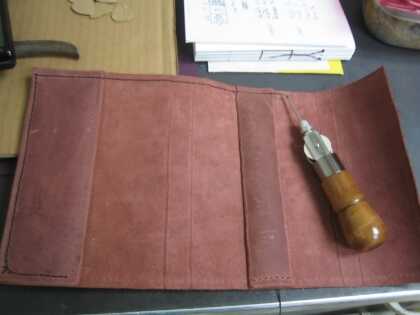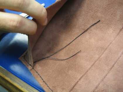 Cuando haces las marcas puntada mojar el cuero primero. Ayuda a las huellas alojarte. Si no tienes no te preocupes una herramienta especial para esto. Moje el cuero y entonces (usando una regla como una regla) ejecutar el borde posterior de un cuchillo de mantequilla a lo largo de su línea de puntada. Luego use un tenedor para hacer las marcas de la puntada.