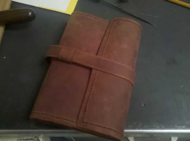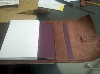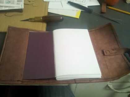 La cubierta se hace ahora y solo necesita el folleto insertado. Algunas personas optan por el folleto a la cubierta exterior de la puntada, pero quería algo en que fácilmente podría cambiar cuando terminé con él, razón por la cual opté incluyen las aletas para mantenerla. Para insertar el folleto me deslicé la página trasera debajo de la aleta más pequeña como iría, luego inserta la primera página debajo de la aleta delantera y empujado hacia adentro, hasta que fue incluso entre los dos.
