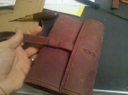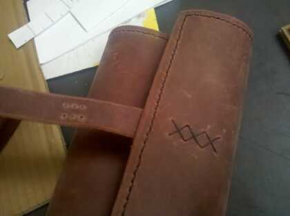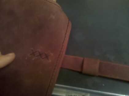 El siguiente paso es la correa para el cierre. Comencé con una tira de cuero mucho demasiado largo, cosido en y entonces corte hacia abajo hasta el tamaño que quería. Lo cosí en el interior de la aleta debido a acaba de hacer más sentido para mí. No me importaba lo que parecía el interior pero quise que fuera para lucir bien.