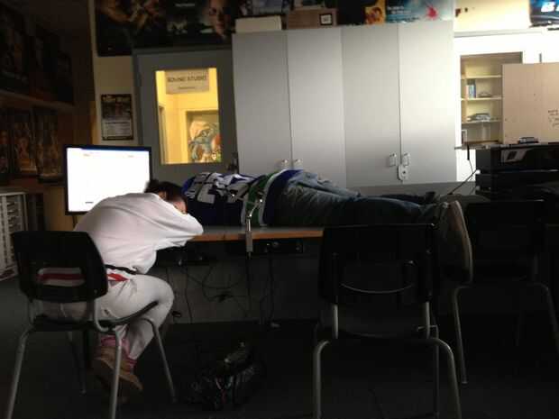 Dormir en clase siempre parece molestar a profesores. Nos adolescentes parecen ser capaces de dormirse en cualquier lugar, ya sea una cama, silla o en este caso, en medio de una estación de animación. A pesar de todo, quedarse dormido en clase (especialmente en números grandes) realmente molesta a maestros.