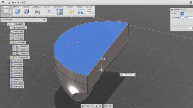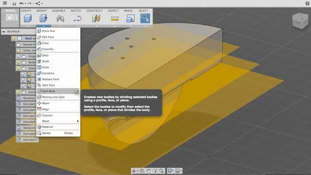 Planos se pueden construir mediante el uso de la construcción -> opción de menú Offset plano e ingresando la cantidad de compensación. Una vez creados los planos, modificar -> Split Body herramienta puede utilizarse en realidad dividir el cuerpo en 4 partes menos profundas.