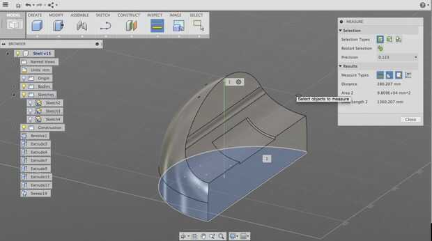 Luego de alinear todas las piezas verticalmente (usando Modificar -> herramienta de alineación) y dispuestas de una manera que parecía eficiente de área. El área total para mi modelo es de 730 mm x 500 mm, o 29 "x 20".