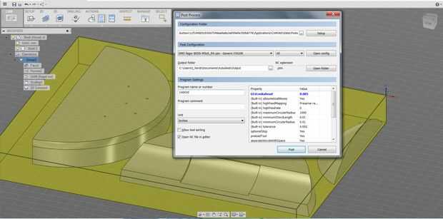 Y eso es todo. Entonces podría correr el script de Post proceso en el menú de acciones para comenzar a exportar algunos G-Code. En las opciones de exportación de Post proceso, tuve que seleccionar pulgadas para las unidades ya que, a pesar de que se puede generar código g en pulgadas y milímetros, algunas de las rutinas previamente programadas en la máquina que estaba usando eran codificado a pulgadas, así que tenía sentido usar pulgadas a lo largo de. Además, tenía que asegurarse de que el programa número y nombre de archivo se compone de exactamente 6 dígitos numéricos. O bien no se muestra en la máquina. Y, aumentar el valor de G51Lookahead a algo como 0.002 o 0.005 aceleró el proceso de fresado. El código G51 es realmente un valor de tolerancia hacia adelante. Se trata de cuán cerca la cabeza de la máquina tiene que llegar a un objetivo antes de que comience el próximo movimiento de ejecución.