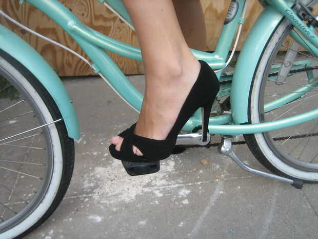 La mayoría de los escépticos del punto al talón alto — pero miran estas fotos. Se puede hacer. Dos cosas son importantes a tener en cuenta mientras pedalea en tacones de aguja: