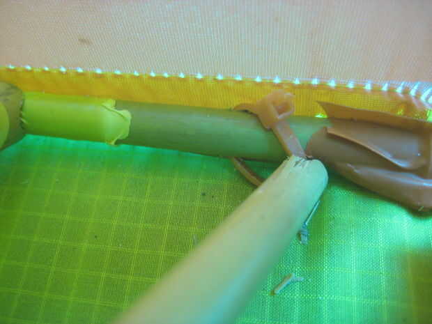 Hay una camilla diagonal que recorre el centro de la manga interior (la diagonal de la N). Esto ya es fijo en un extremo, por lo que un extremo debe colgar de la parte inferior derecha de la derecha como se muestra en la primera foto. La V al final de esto simplemente encaja en el lazo de cable rojo de la varilla longitudinal justo en esa esquina. Digo simplemente pero es un poco incómodo. Este refuerzo ayuda a mantener todo aproximadamente cuadrados.