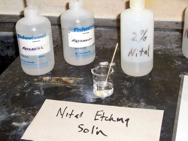 Poner en guantes, un delantal y gafas de seguridad. Poner la botella de nital en la campana. Asegúrese de que se encienden la luz y el ventilador en la campana. Llene un vaso con agua y coloque en la campana como se muestra en la figura 13. PELIGRO: nital puede ser explosivo cuando está mezclado con etanol. Manejar el nital con extrema precaución.